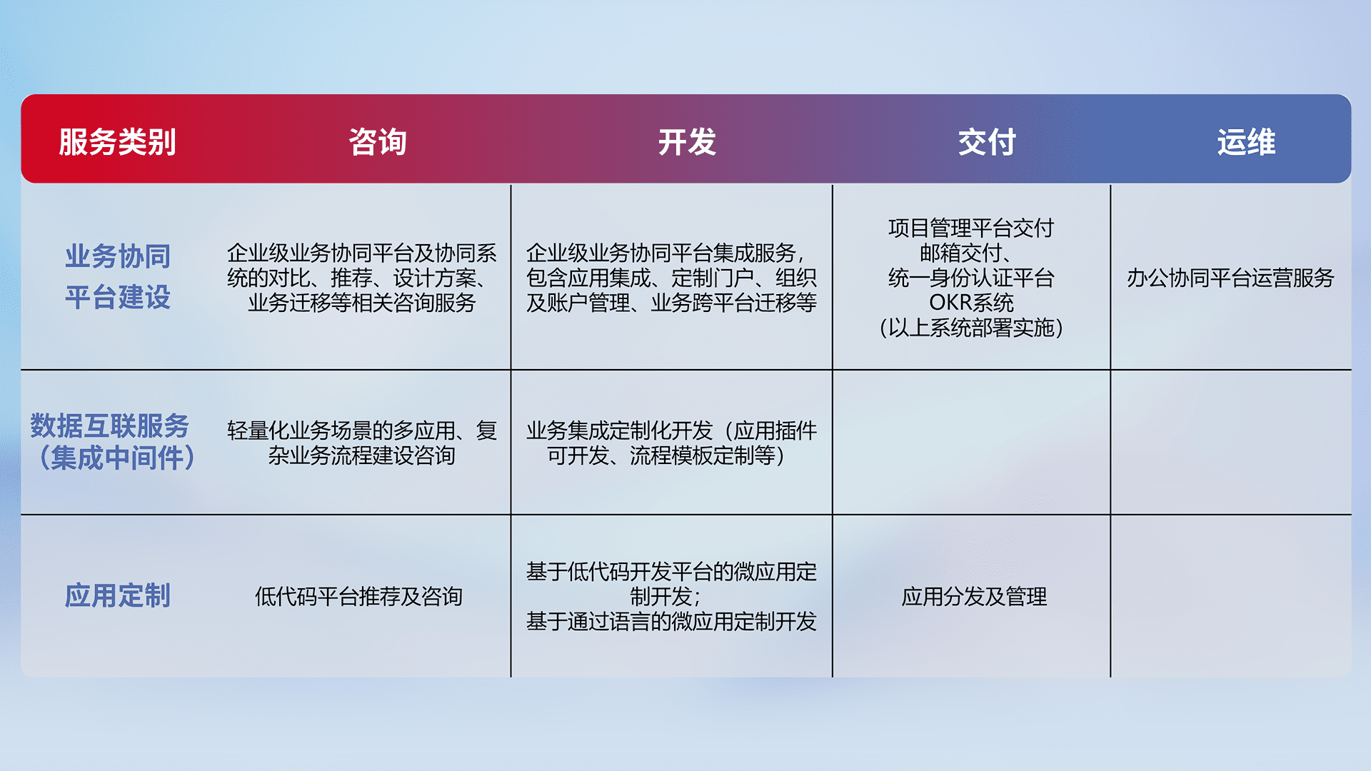 针对钉钉、、、、企微、、、、IDaas等平台级产品提供产品的规划、、、、方案、、、、交付、、、、定制化开发等服务,,实现如统一协同办公、、智能客户服务、、、、混合会议管理、、智能数据查询、、、、等业务场景,,,,实现数字化转型。。。